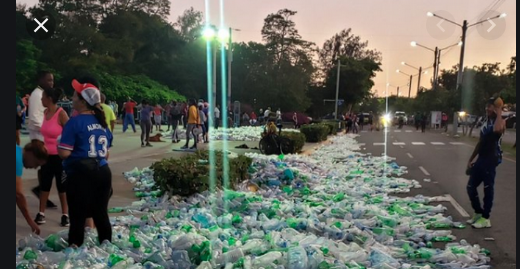 Como “una pista de plástico”, definieron los testigos a la cantidad de botellas plásticas que amaneció próximo al área donde están las máquinas públicas de hacer ejercicios y el área de zumba.