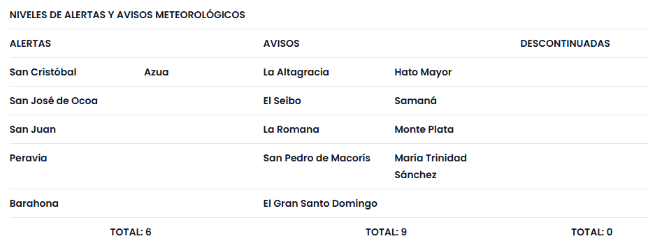 Resumen: siguen vigentes los niveles de alerta y avisos meteorológicos, producto de las lluvias registradas y las que se pronostican, debido a la humedad e inestabilidad predominante, dejada tras el paso de la activa onda tropical con potencial ciclónico del 80 %. Los aguaceros, con tormentas eléctricas y ráfagas de viento persistirán en la República Dominicana.