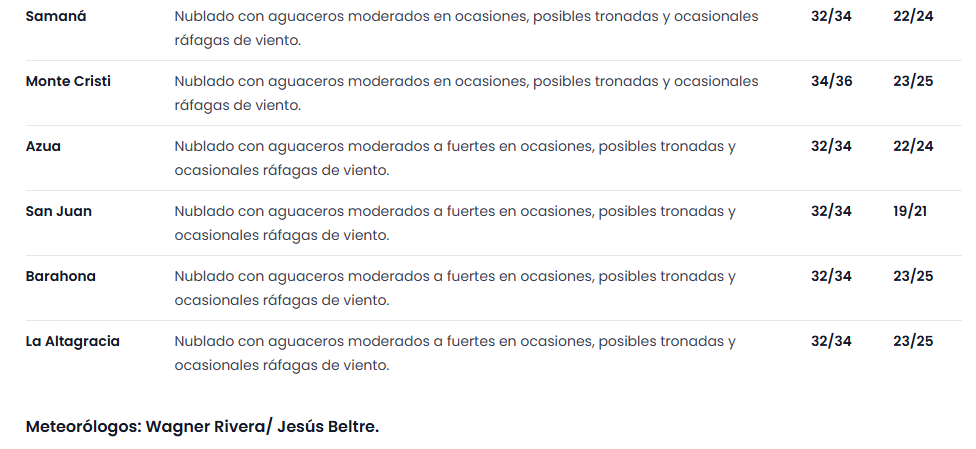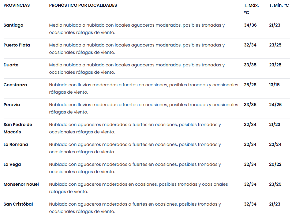 Distrito Nacional: medio nublado con locales aguaceros moderados a fuertes en ocasiones, tronadas aisladas y ocasionales ráfagas de viento.