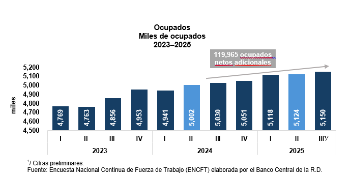 El nivel total de ocupados se ubicó en 5,149,829 trabajadores, para un incremento interanual de 2.4 %, equivalente a 119,965 ocupados netos con respecto al período julio-septiembre de 2024. La tasa de ocupación (TO), es decir la relación entre el total de ocupados y la población en edad de trabajar (PET), se situó en 63.1 % para julio-septiembre de 2025, superando en 1.0 punto porcentual a la tasa observada en el tercer trimestre del año 2024.