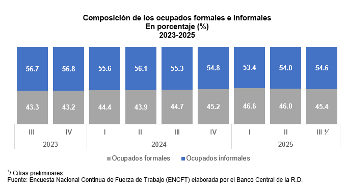 En términos de composición del empleo, se evidencia que, del aumento interanual de 119,965 trabajadores, los ocupados formales contribuyeron con un total neto de 88,583 personas (73.8 %) en julio-septiembre de 2025, mientras que, los informales aumentaron en 31,382 trabajadores (26.2 %). Como resultado, la tasa de informalidad se ubicó en 54.6 % en el tercer trimestre de 2025 para una disminución de 0.7 p.p. respecto al 55.3 % registrado en igual período de 2024.