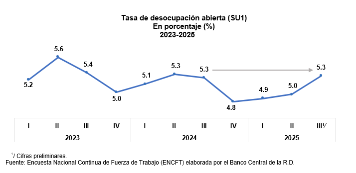 En cuanto a la tasa de desocupación abierta (indicador de subutilización SU1), es decir, el porcentaje de los desocupados que están buscando activamente trabajo como proporción de la fuerza laboral, la misma se ubicó en 5.3 % en julio-septiembre de 2025, permaneciendo sin cambios con respecto a igual trimestre de 2024.