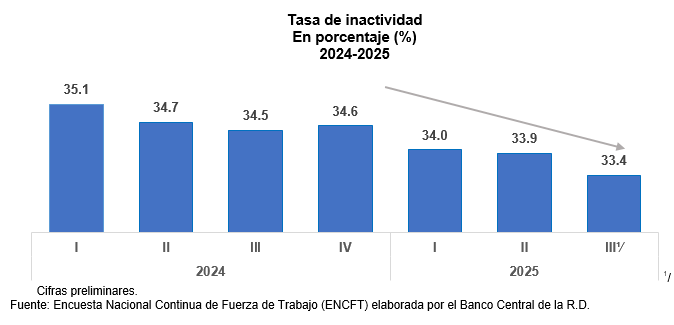 En el mismo orden, la población inactiva, aquellos en edad de trabajar que no se encuentran ocupados ni en búsqueda activa de trabajo, se situó en 2,724,763 personas en julio-septiembre de 2025 para una reducción de 67,748 inactivos en comparación con el mismo trimestre de 2024. De esta manera, la tasa de inactividad presenta una reducción de 1.1 puntos porcentuales, al disminuir de 34.5 % en el tercer trimestre de 2024 a 33.4 % en igual período de 2025.