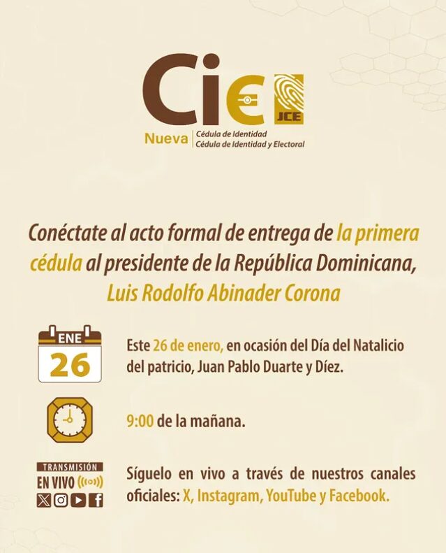 Nacionales (En vivo) Entrega oficial de la nueva cédula al presidente Luis Abinader By Brenda Guerrero 26 de enero de 2026 0 2 Cuota FacebookTwitterPinterestWhatsApp De lectura obligatoria JCE entregará primera cédula de identidad y electoral al presidente Luis Abinader Corona este lunes 25 de enero de 2026 JCE presenta avances del cambio de la nueva cédula a organizaciones políticas 23 de enero de 2026 Representantes del Banco Mundial destacan estabilidad y crecimiento sostenido de la República Dominicana tras visita al presidente Abinader 21 de enero de 2026 Presidente Abinader destaca transformación histórica de las Fuerzas Armadas al presentar el primer blindado FURIA ensamblado en la República Dominicana 16 de enero de 2026 Brenda GuerreroPeriodista El Pleno de la Junta Central Electoral (JCE) entregará este lunes 26 de enero, fecha del natalicio de Juan Pablo Duarte, la primera cédula de identidad y electoral al presidente de la República, Luis Abinader Corona. Haz clic para verlo en vivo TagsJCEnueva Cédula de IdentidadPresidente Abinader Cuota FacebookTwitterPinterestWhatsApp Artículo anteriorIberia y Mitur llegan a un acuerdo para aumentar en un 30 % los vuelos a República Dominicana en 2026 - Advertisement - - Advertisement - Más artículos JCE entregará primera cédula de identidad y electoral al presidente Luis Abinader Corona este lunes 25 de enero de 2026 JCE presenta avances del cambio de la nueva cédula a organizaciones políticas 23 de enero de 2026 República Dominicana logra acuerdos en FITUR por más de 885 mil millones de pesos. 23 de enero de 2026 DEJA UNA RESPUESTA Cancelar respuesta Comentario: Por favor ingrese su comentario! Nombre: Por favor ingrese su nombre aquí Correo electrónico: ¡Has introducido una dirección de correo electrónico incorrecta! Por favor ingrese su dirección de correo electrónico aquí Sitio web: Guardar mi nombre, correo electrónico y sitio web en este navegador la próxima vez que comente. Are you human? Please solve: Δ - Advertisement - Último artículo Iberia y Mitur llegan a un acuerdo para aumentar en un 30 % los vuelos a República Dominicana en 2026 25 de enero de 2026 JCE entregará primera cédula de identidad y electoral al presidente Luis Abinader Corona este lunes 25 de enero de 2026 JCE presenta avances del cambio de la nueva cédula a organizaciones políticas 23 de enero de 2026 República Dominicana logra acuerdos en FITUR por más de 885 mil millones de pesos. 23 de enero de 2026 La Casita Dominicana llena de sabor, color y alegría FITUR 23 de enero de 2026