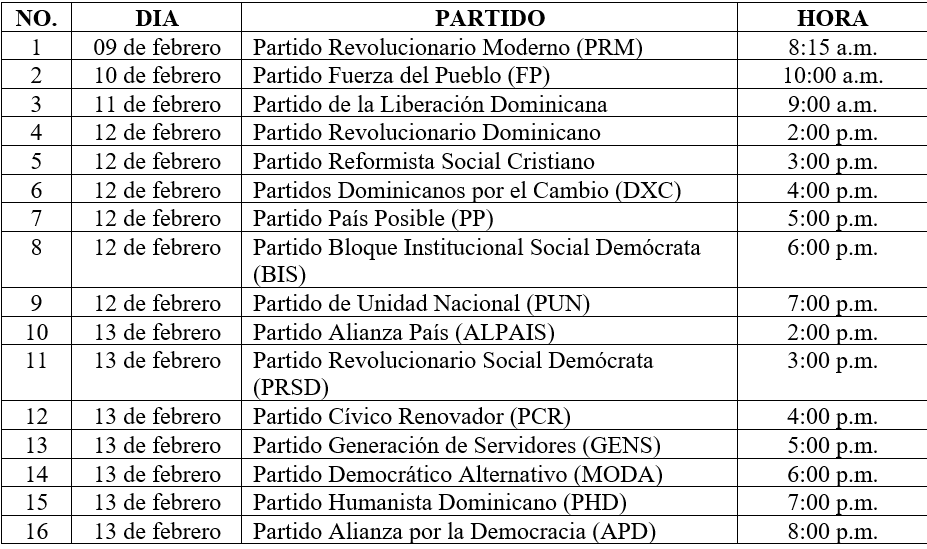 La Junta Central Electoral (JCE) compartió este fin de semana el calendario de captura y entrega inmediata de cédula de identidad y electoral a las autoridades de los partidos, agrupaciones y movimientos políticos desde este lunes 09 al viernes 13 de febrero de 2026.