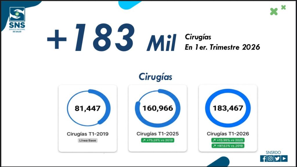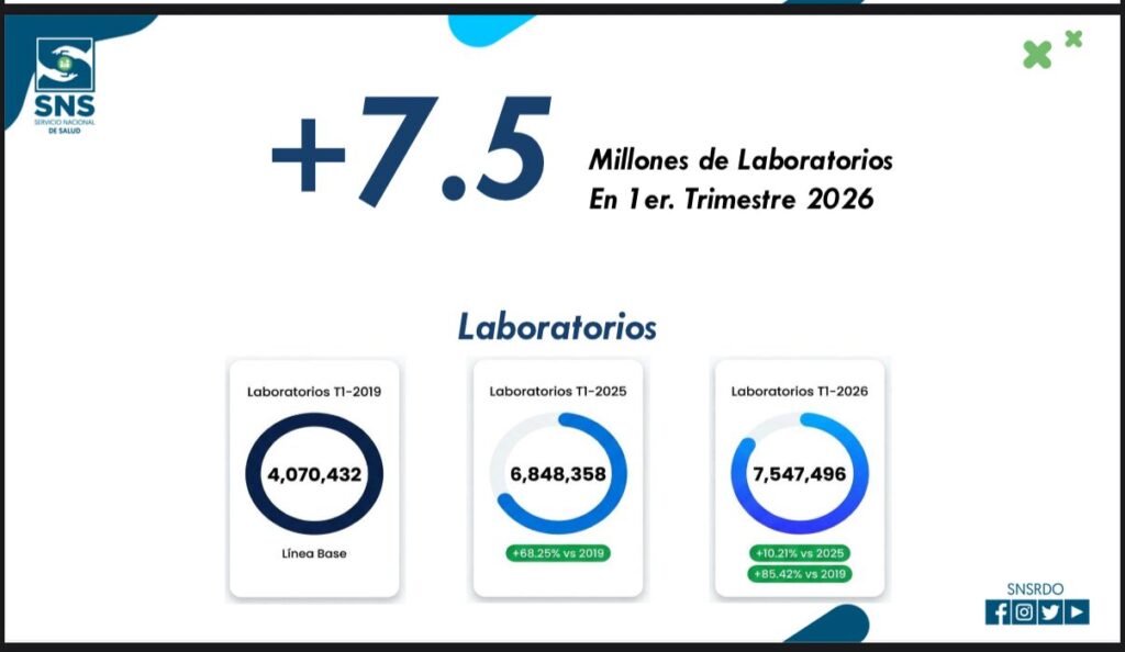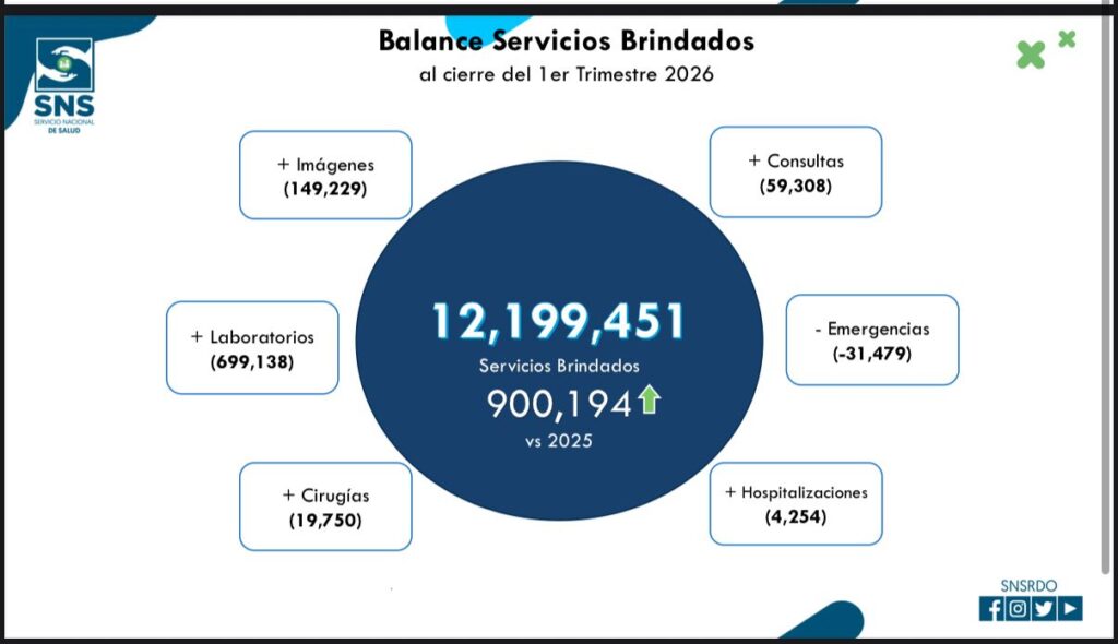 Santo Domingo. – En el primer trimestre de 2026, el Servicio Nacional de Salud (SNS) ofreció más de 12 millones de servicios de salud a la población, para un total de 12,199,327 atenciones, lo que representa un incremento de 7.97 % en la producción, con 900,082 servicios adicionales en comparación con el mismo período de 2025, cuando se registraron 11,299,245, así lo dio a conocer su director ejecutivo, doctor Julio Landrón.